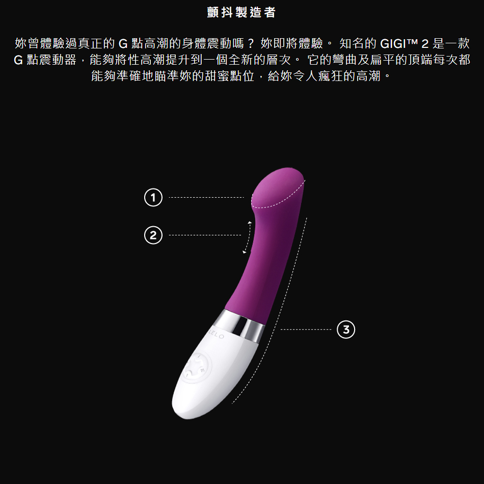 妳曾體驗過真正的 G 點高潮的身體震動嗎? 妳即將體驗。 知名的 GIGI™ 2 是一款 G 點震動器,能夠將性高潮提升到一個全新的層次。 它的彎曲及扁平的頂端每次都能夠準確地瞄準妳的甜蜜點位,給妳令人瘋狂的高潮。