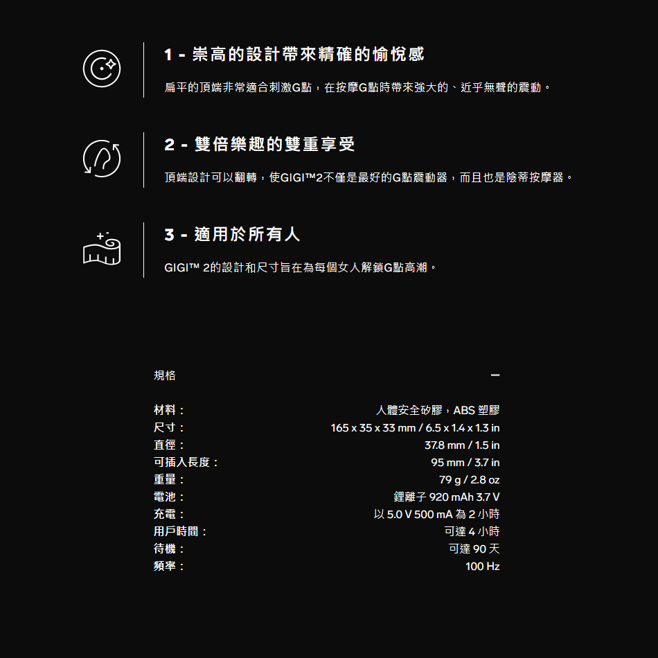 扁平的頂端非常適合刺激G點,在按摩G點時帶來強大的、近乎無聲的震動。