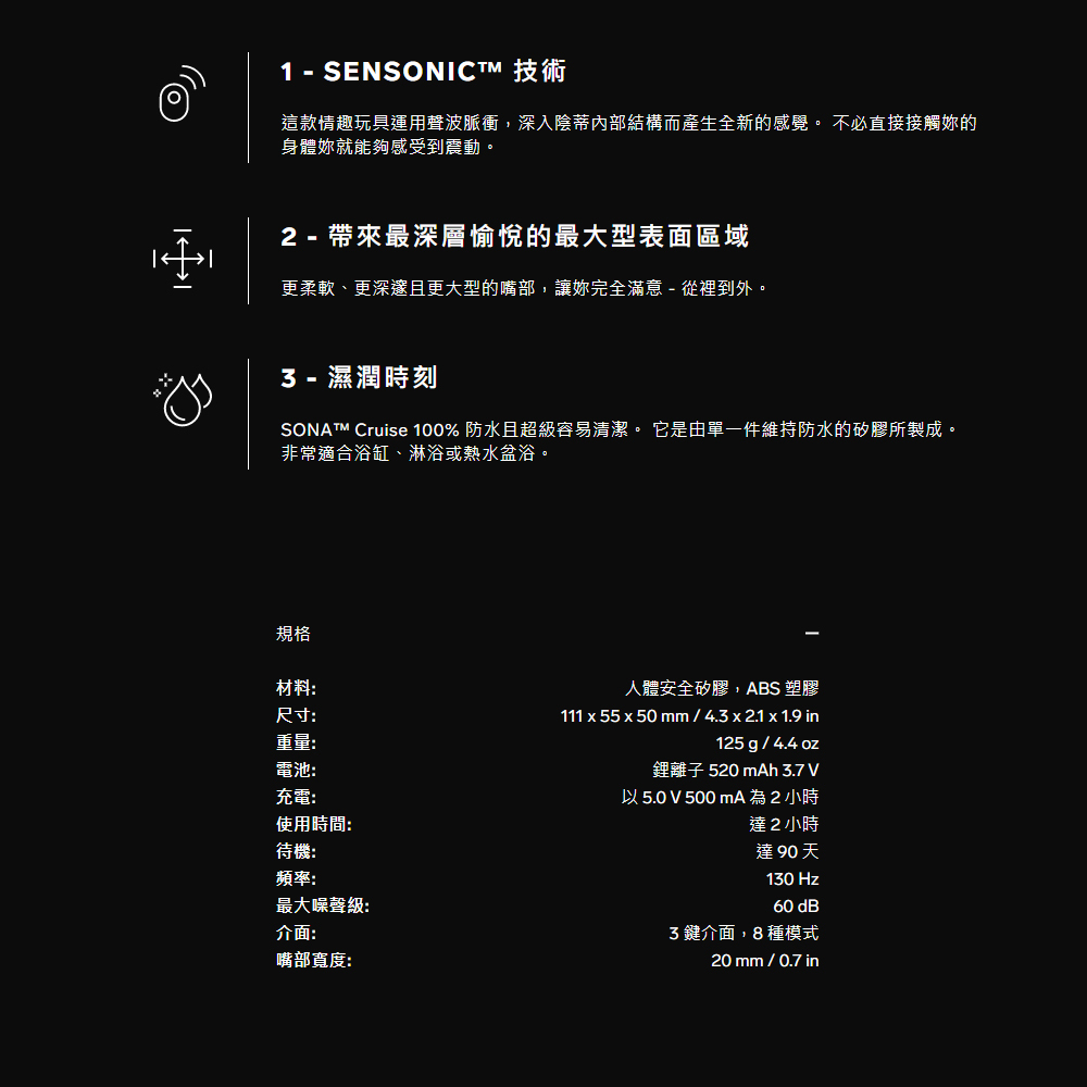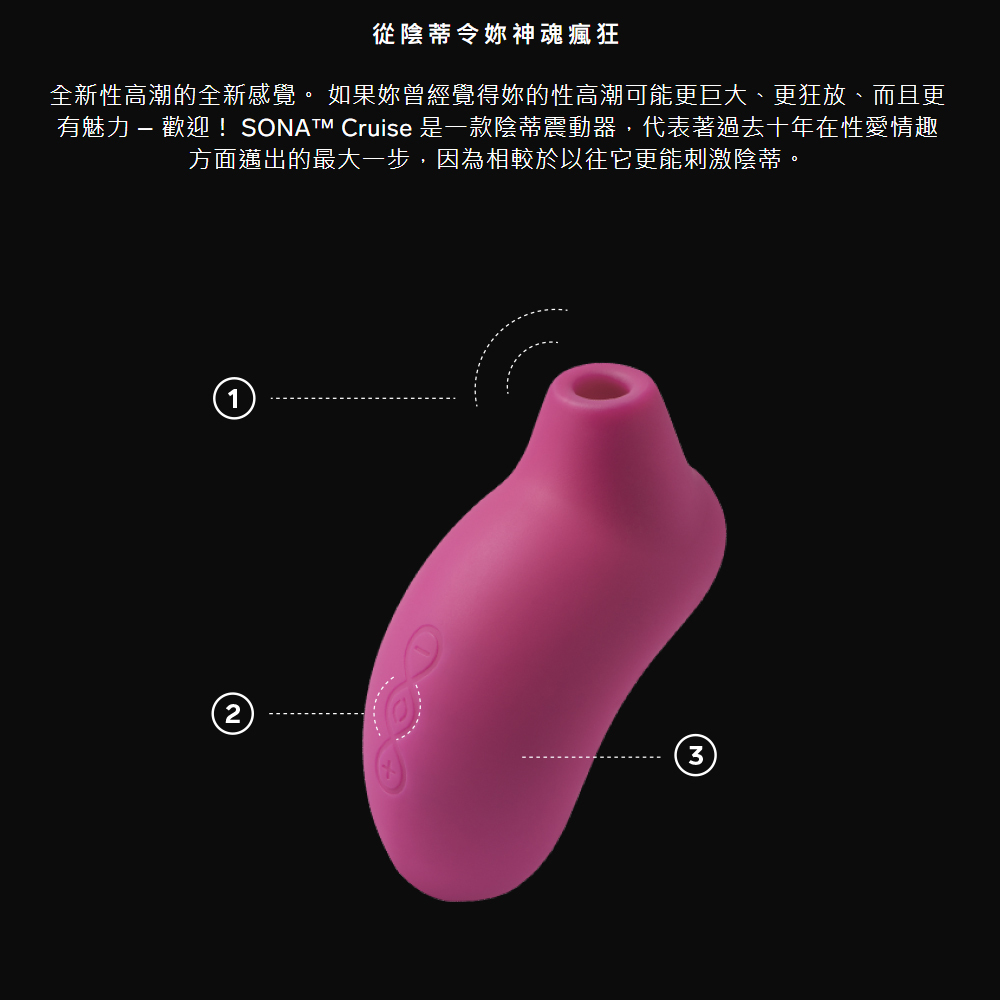 全新性高潮的全新感覺。 如果妳曾經覺得妳的性高潮可能更巨大、更狂放、而且更有魅力 – 歡迎! SONA Cruise 是一款陰蒂震動器,代表著過去十年在性愛情趣方面邁出的最大一步,因為相較於以往它更能刺激陰蒂。