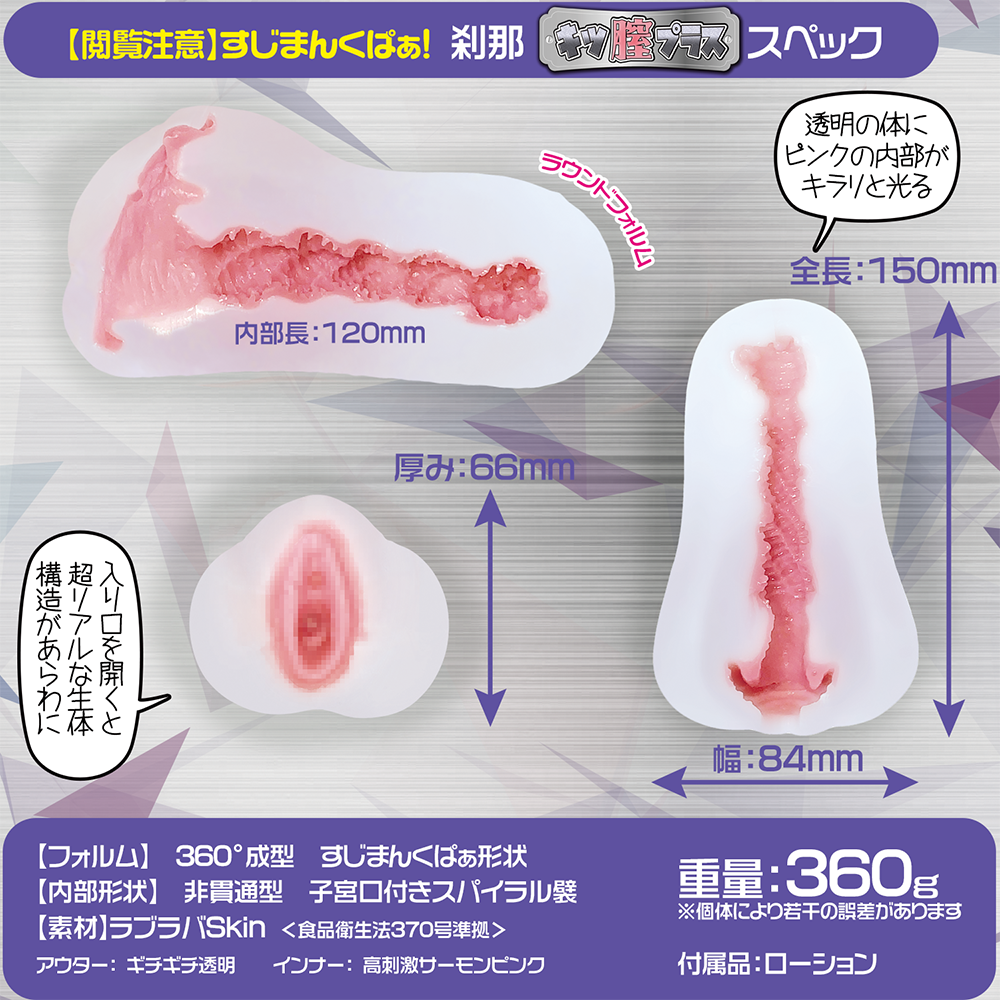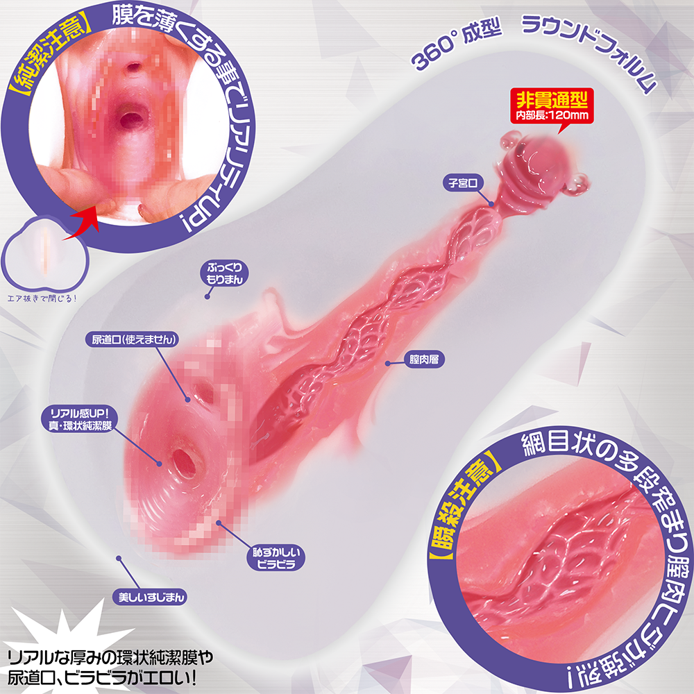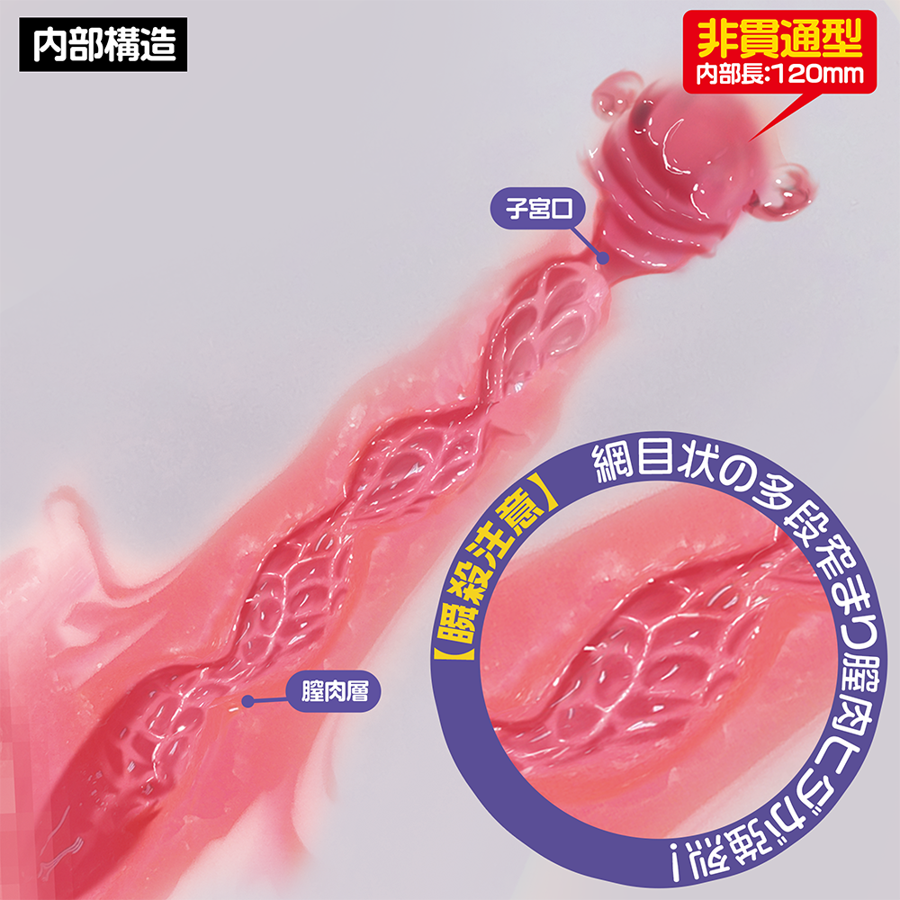 2層構造,入口有真環狀純潔膜,首次使用需要先破處,入內即進入網狀紋狹穴地帶,未段更有仿子宮口收窄位,刺激度一流!