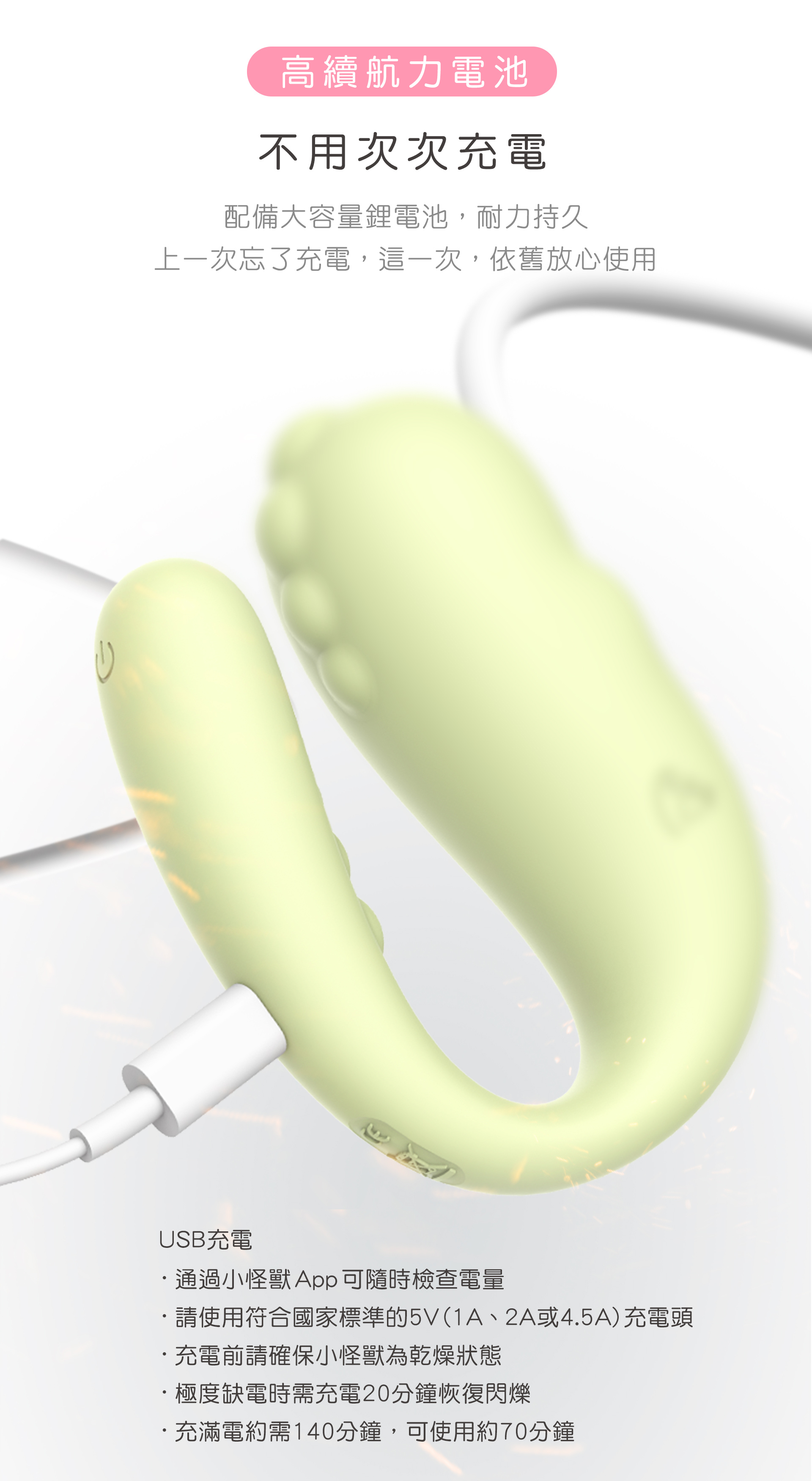 📢貼心提醒:本產品請使用 5V/1A 充電器充電,並建議每月充電一次保持電池活性,勿長時間空電放置,以免損傷電池。